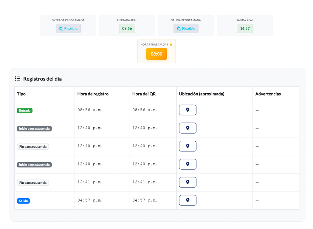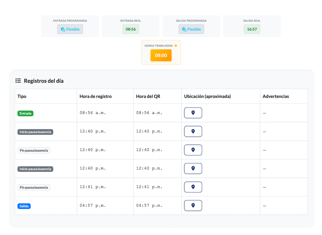 AS iCheck identifica automáticamente al colaborador y registra si se trata de una entrada, salida o comida, junto con la ubicación desde donde se realizó.