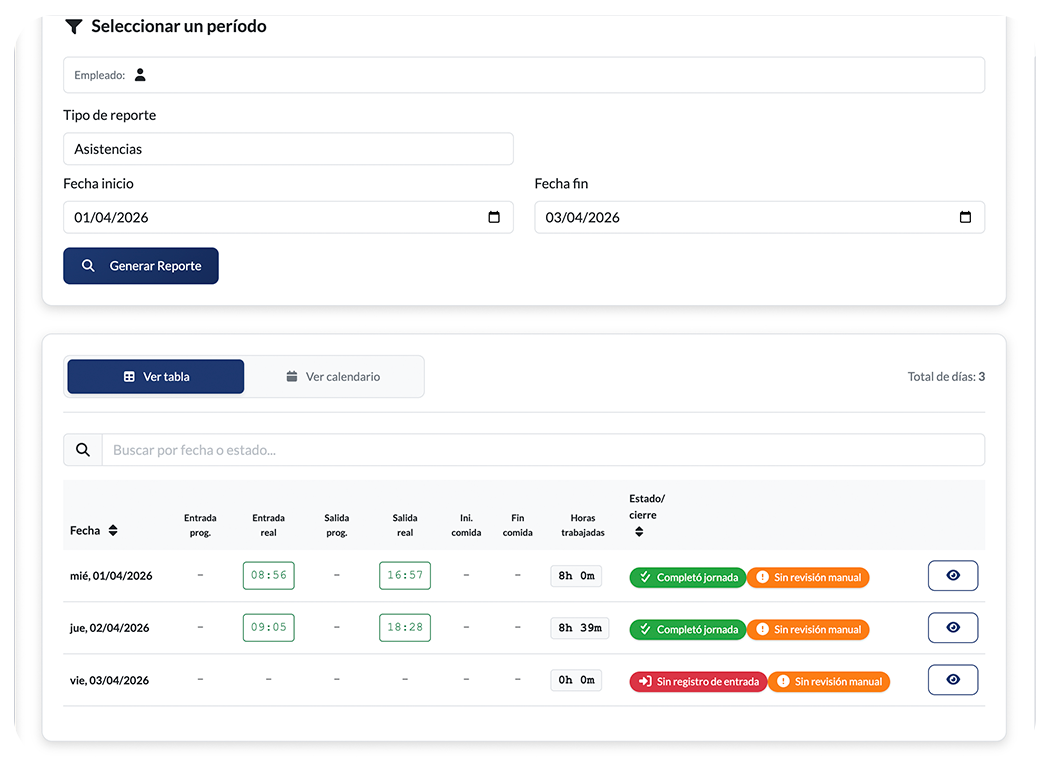Identifica faltas, retardos y ausencias de forma rápida para actuar antes de que afecten la operación.